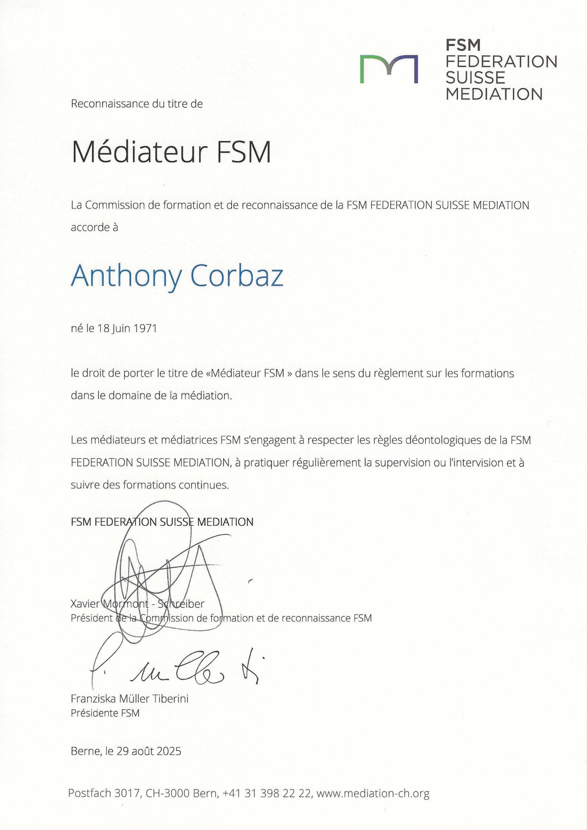- Formation, « Certificate of Advanced Studies » CAS en médiation, Université de Fribourg